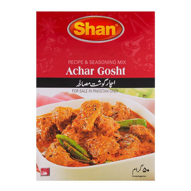 han Achar Gosht is a flavorful and aromatic spice blend that adds a tantalizing twist to your meat dishes. With a perfect blend of carefully selected spices, this 50g pack offers a convenient way to infuse your lamb or beef with the rich and tangy taste of traditional Achari (pickle) spices. The combination of zesty herbs, piquant mustard seeds, and aromatic fenugreek creates a bold and distinctive flavor profile that elevates your cooking to new heights. Whether you're a seasoned chef or a home cook looking to spice up your meals, Shan Achar Gosht is a versatile and easy-to-use seasoning that brings the authentic taste of Pakistani cuisine to your table. Add a burst of excitement to your meat preparations with this well-balanced spice blend, guaranteed to leave your taste buds craving more.