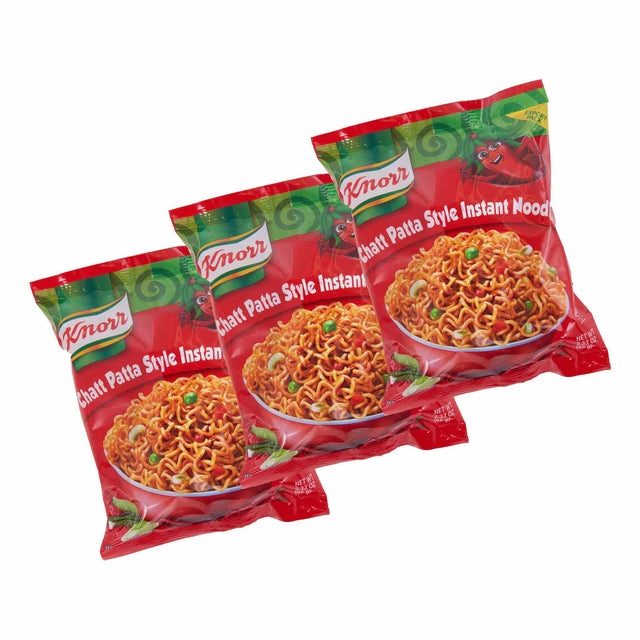 Prepare a tasty snack in less time with Knorr Noodles Chatt Patta. Made with wheat flour, the cake of noodles is accompanied by a separate sachet of tastemaker. This special Chatt Patta seasoning is a dry blend of various ingredients such as salt, sugar, red chili powder, cinnamon powder, soy sauce, lime flavor, and carrot and tomato flakes. For a more enhanced taste, you can add fresh portions of chopped vegetables, a few other sauces, cheese and herbs. It makes up for a sour and spicy bowl of noodles with an aroma that appeal your appetite.
