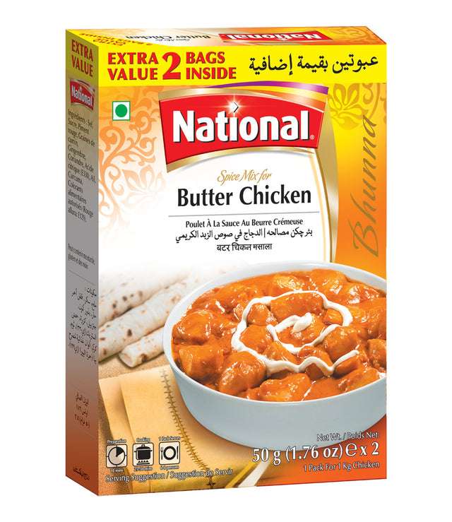National Butter Chicken Masala 50G is a spice blend crafted to help you prepare rich and creamy butter chicken with ease. It contains a mix of aromatic spices that enhance the flavor of the dish, ensuring a restaurant-style taste at home